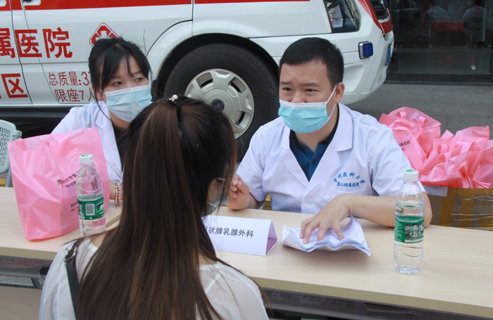 为贯彻落实省、州、校开展党史学习教育和“牢记殷切嘱托、忠诚干净担当、喜迎建党百年”专题教育相关文件精神,响应中国甲状腺科普专委会号召,为我国甲状腺疾病知识的宣传普及做出更大贡献。6月8日,我院内科第二党支部组织相关科室在门诊综合大楼前开展了“2021年国际甲状腺疾病宣传周”义诊活动,本届宣传周的主题为:“识别百变甲亢,构筑健康人生”。内科第二党支部书记、内分泌科主任张前,内分泌科副主任陈世碧、主治医师吴谋彬等支部所属相关科室医务人员参加义诊。