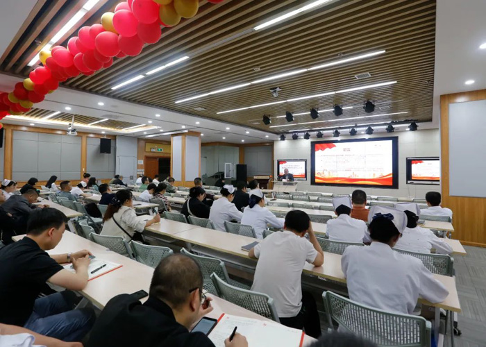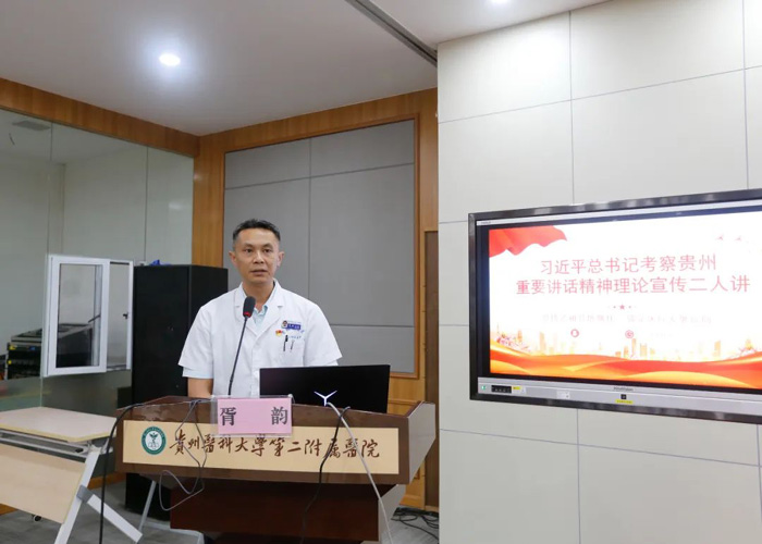 随后,胥韵带来题为《深耕疼痛医学二十载践行医者担当谱新篇》的精彩宣讲。他结合自身在疼痛医学领域二十多年的工作经验,分享了自己在践行医者使命、为患者解除病痛过程中的感人故事和深刻感悟。他表示,习近平总书记考察贵州重要讲话精神激励着每一位医务工作者坚守初心、勇担使命。在日常工作中,他和团队始终以患者为中心,不断探索创新疼痛治疗技术,提高医疗服务水平。胥韵的宣讲生动鲜活,让在场的职工深刻感受到了一名医者的责任与担当,也激发了大家立足本职岗位、践行初心使命的决心。