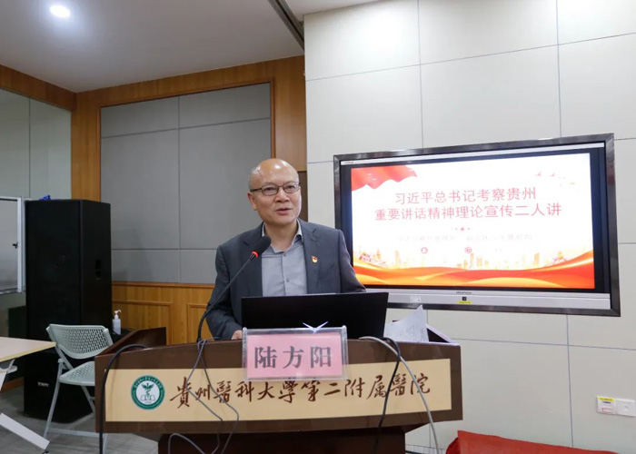 会上,陆方阳以《领悟领袖黔地嘱托,锚定医院发展航向——习近平总书记考察贵州重要讲话精神理论宣传二人讲》为题开展宣讲。他深入解读习近平总书记考察贵州重要讲话的核心要义与丰富内涵,并强调,习近平总书记的重要讲话为贵州的发展指明了前进方向,也为医院的各项工作提供了根本遵循。他结合医院实际情况,从作风建设、医疗服务质量提升、人才队伍建设、学科发展等多个方面进行了详细阐述,为医院未来的发展锚定了清晰的航向。他鼓励全体职工立足岗位,以更加饱满的热情和昂扬的斗志投入到工作中,为医院的发展贡献自己的力量。他要求,党员干部要以习近平总书记考察贵州重要讲话精神为指引,不忘初心、牢记使命,真抓实干、奋勇前进,不断加强作风建设,严格落实中央八项规定精神,深入开展医疗系统教育整顿,努力推动医院高质量发展,为保障人民群众的生命健康和全省医疗卫生事业的发展作出新的更大贡献。